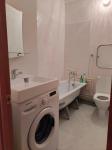 Ванная комната оборудована ванной, тумбой с раковиной, навесным шкафчиком с зеркалом и стиральной машиной.