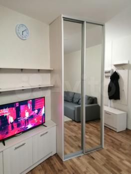 Студия полностью готова к проживанию: в комнате и на кухне есть вся необходимая мебель и посуда. Из техники — кондиционер, холодильник, микроволновка, чайник, телевизор и стиральная машина.