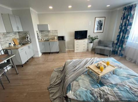 Для вашего удобства квартира полностью оборудована всей необходимой мебелью и надёжной техникой: входная группа с вешалкой для верхней одежды и обувницей, большой вместительный шкаф, двуспальная кровать, небольшой, но вместительный комод, прекрасная кухня с варочной панелью, холодильник, стиральная машинка, микроволновая печь, чайник, обеденный столик и 2 стула, телевизор.