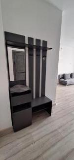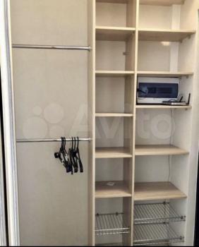 Раскладной диван, мягкий большой ковер, кондиционер, телевизор, пылесос, туалетный столик с зеркалом и подсветкой, шкаф с открытыми полками, два комода, обувница, вешалка настенная для одежды;