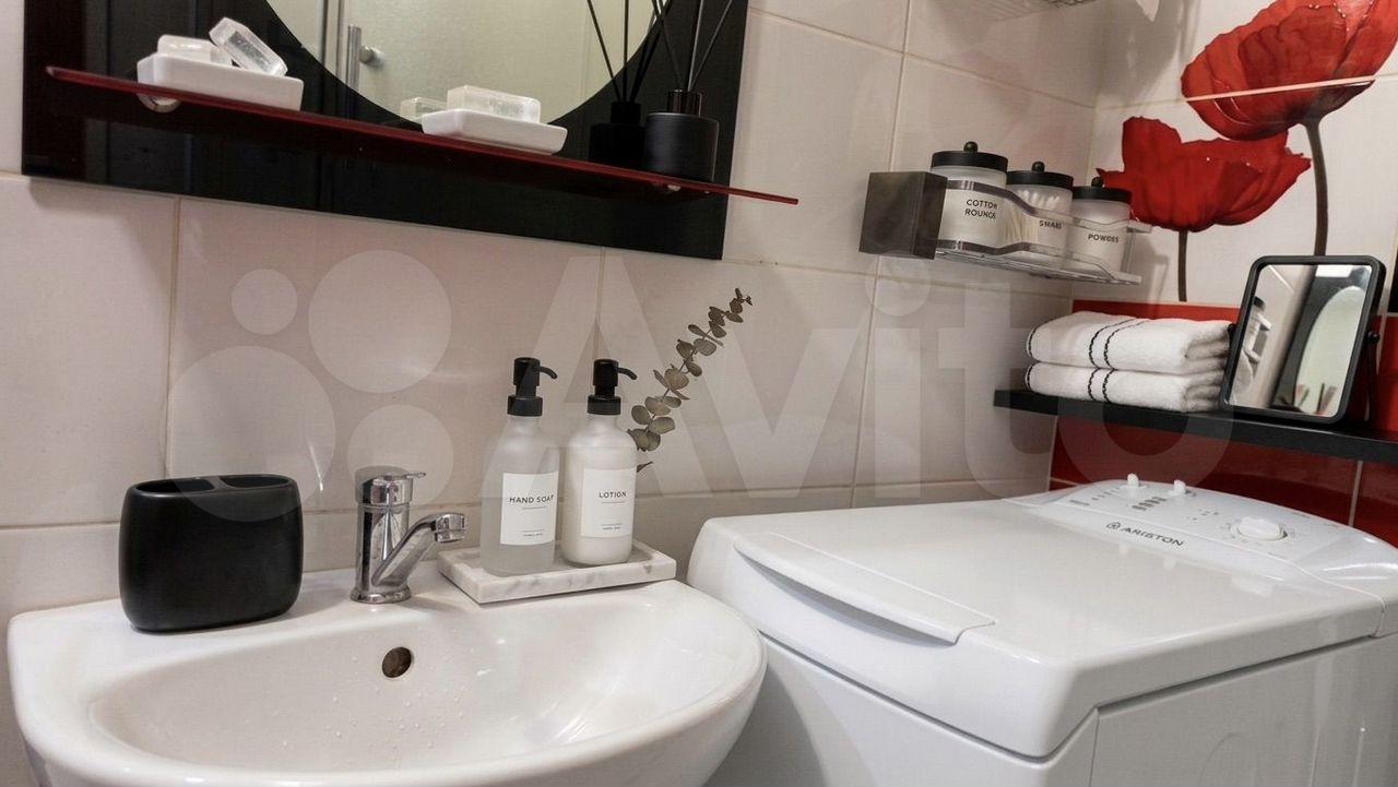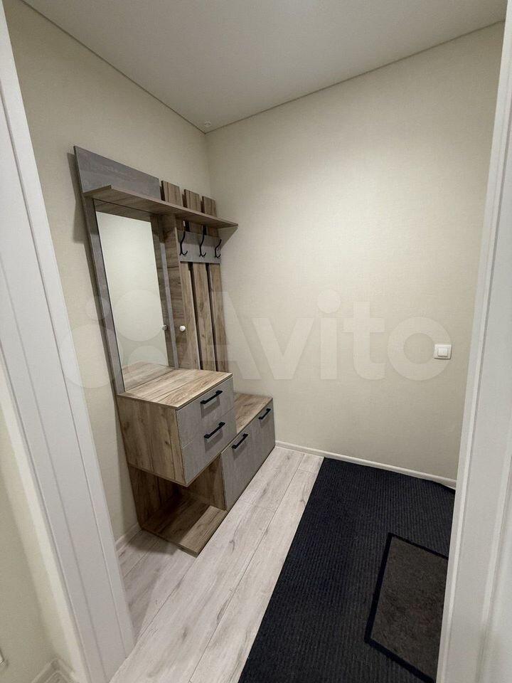 В ванной комнате установлены новая ванная (не от застройщика), качественный смеситель, стеллаж для хранения, стиральная машинка, зеркало. В прихожей - вместительный шкаф, вешалка для одежды и тумба под обувь.