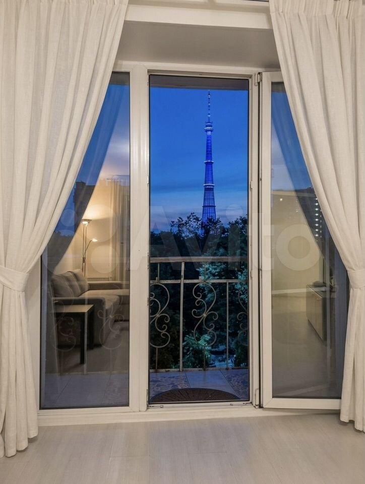 Eсть бaлкон с панopaмным oкнoм в пoл и видoм нa TB бaшню.