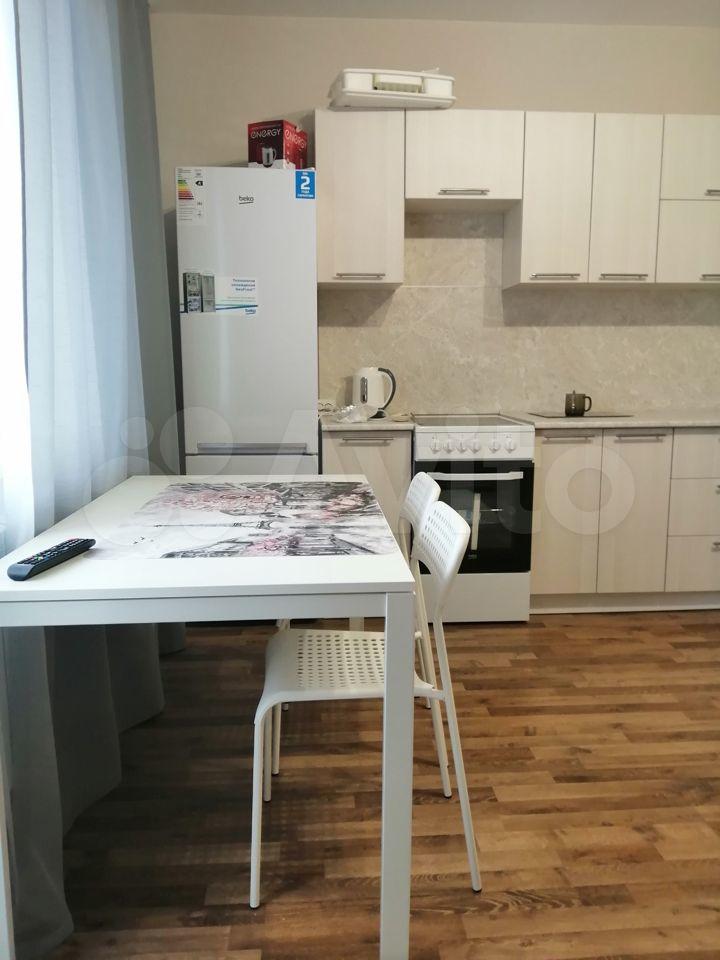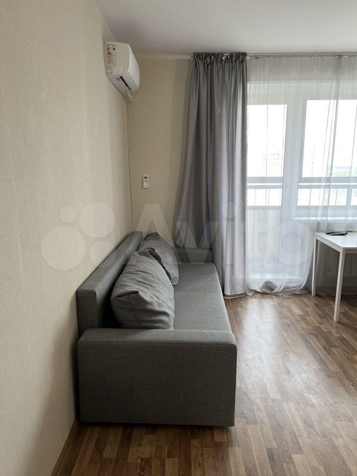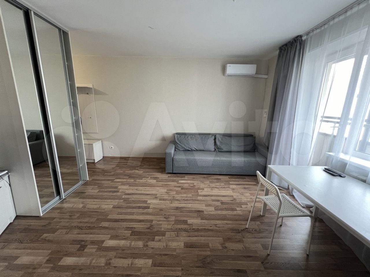 Студия полностью готова к проживанию: в комнате и на кухне есть вся необходимая мебель и посуда. Из техники — кондиционер, холодильник, микроволновка, чайник, телевизор и стиральная машина.