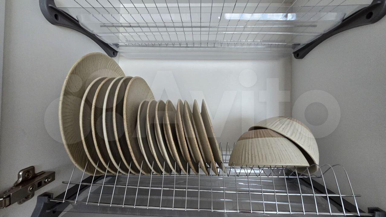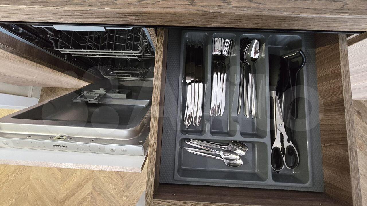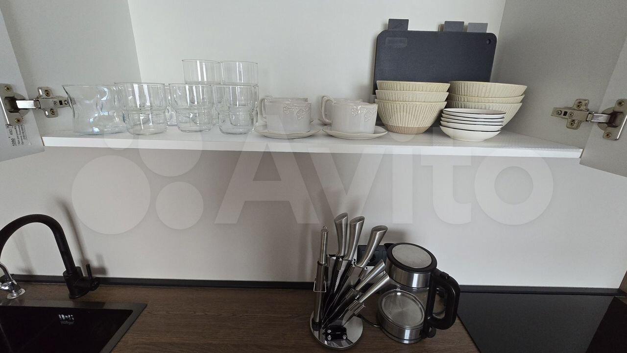 Кухонный гарнитур с качественной фурнитурой, обеденный стол из каленого стекла, спальный гарнитур «Шатура», раскладной диван с ортопедическим основанием. Большой эргономичный холодильник, варочная поверхность, духовой шкаф, микроволновая печь, телевизор, стиральная машина, а также чайник, утюг и сушилка для белья.
