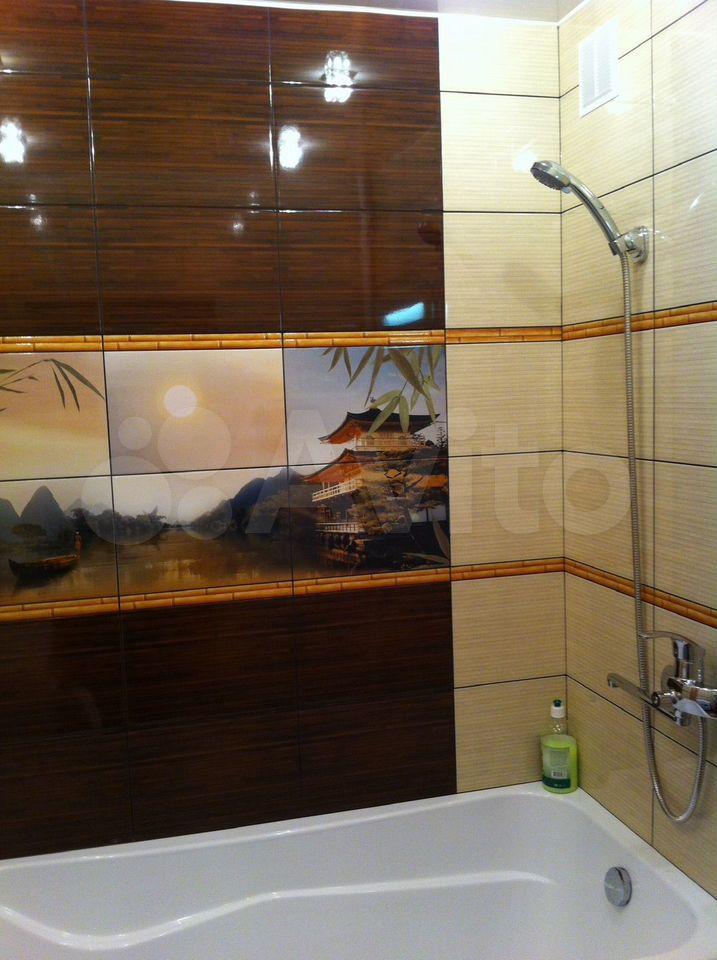 Санузел совмещенный, оформлен плиткой с декоративными элементами. Из окон открывается вид на зеленый двор. Лоджия добавляет дополнительное пространство для отдыха.