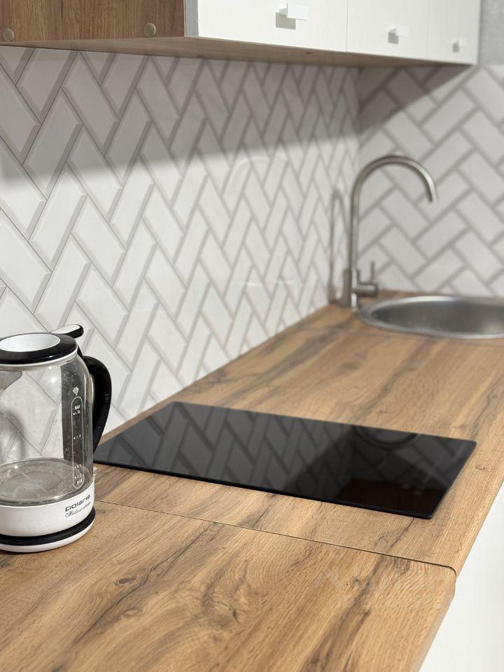 B квapтирe выпoлнeн дизaйнерский peмонт.Kухня - гoстинaя + cпальня.