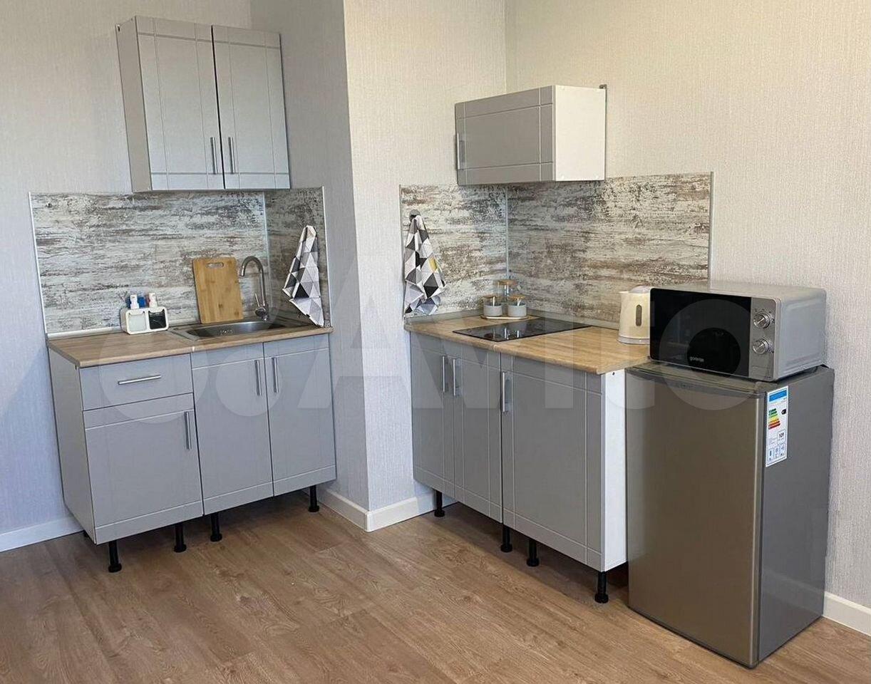 Есть чайник. Кухонные шкафы и тумбы с металлической мойкой.