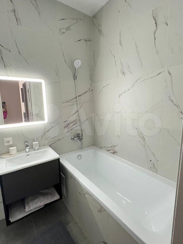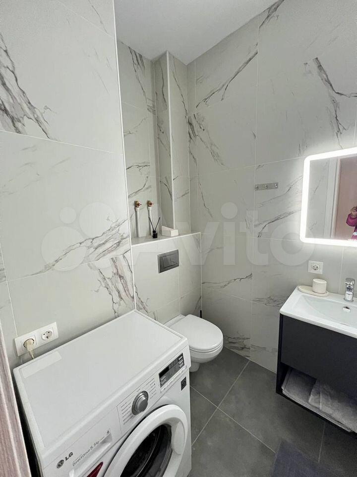 Встроенная стиральная машина, большое зеркало с подсветкой, подвесной туалет, большой стеклянный душ;
