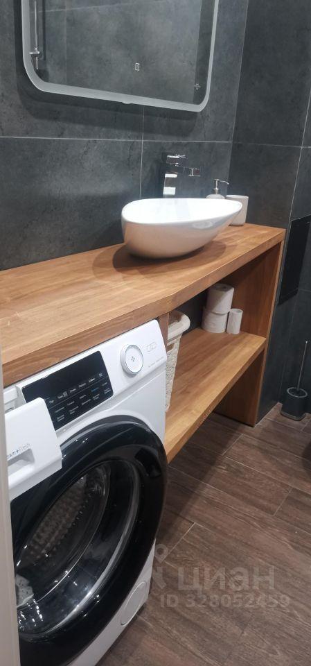 Ванная комната оборудована ванной, тумбой с раковиной, навесным шкафчиком с зеркалом и стиральной машиной.
