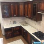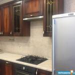На кухне - встроенный кухонный гарнитур из массива дуба, каменная мойка, посудомоечная машина, газовая поверхность bosch, духовой шкаф bosch, большой холодильник, вытяжка, чайник, телевизор, стол и стулья. Есть посуда.