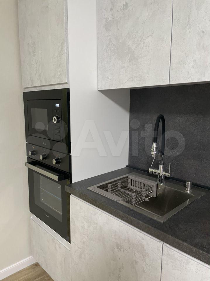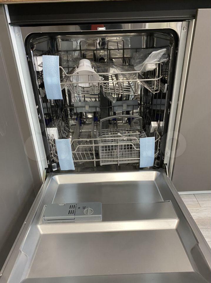 - кухня-гостиная (раскладывающийся диван, раздвижной обеденный стол, телевизор (smart), встроенная варочная панель, духовой шкаф, вытяжка, посудомоечная машина, холодильник, СВЧ печь, чайник);