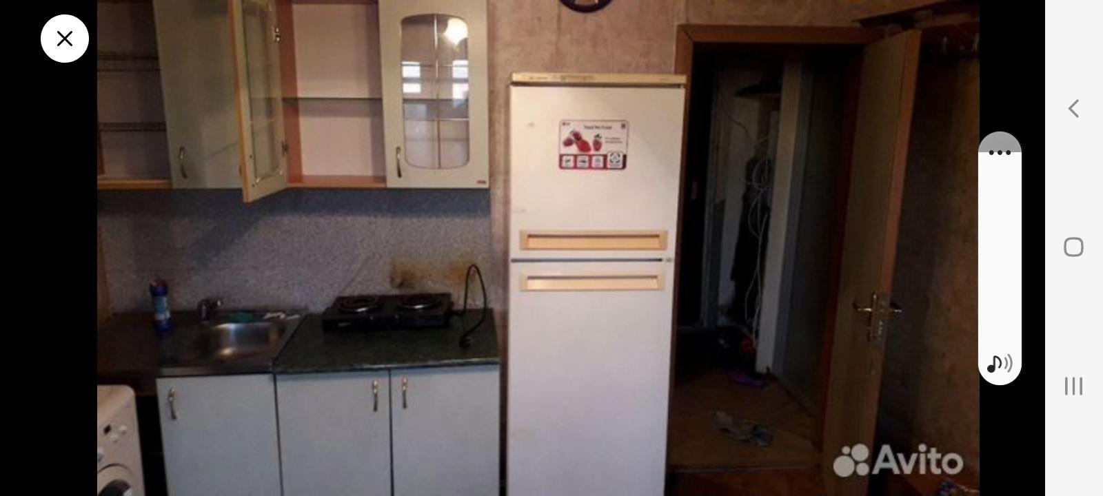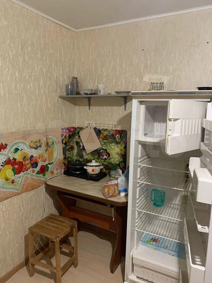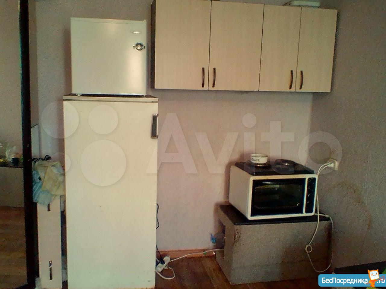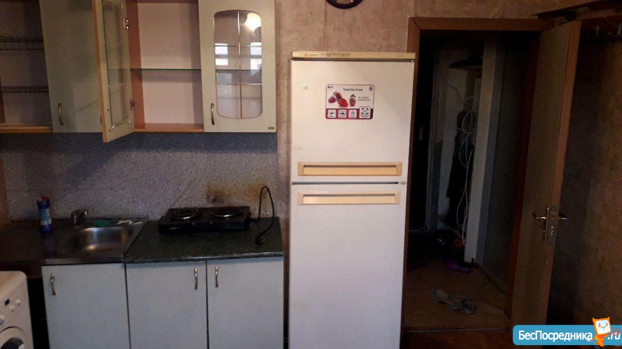 В комнате есть кухонный гарнитур с плитой, диван, холодильник.