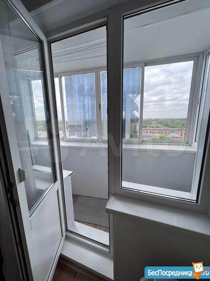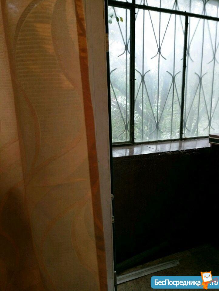 В комнате - теплый, застекленный балкон, из окон открывается вид на зеленый парк. Две железные двери на входе в квартиру.