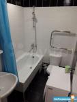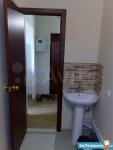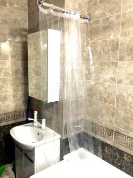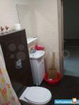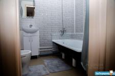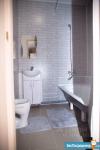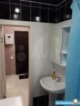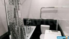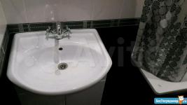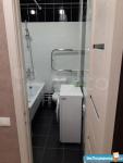 2. Ванна-туалет (сан.узел) отделан кафелем в черно-белых тонах, выполнен черный глянцевый потолок. Есть стиральная машина LG на 4 кг. Ванна, унитаз, раковина, зеркало.