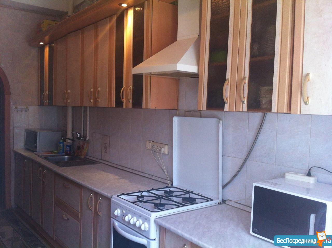 Две смежные комнаты, в одной комнате ковролин, в другой линолеум, двухуровневые потолки, точечные светильники, из мебели: шкаф, диван, тумба под тв, телевизор, стол журнальный, стол обеденный, кухонный гарнитур, стиральная машинка,холодильник!