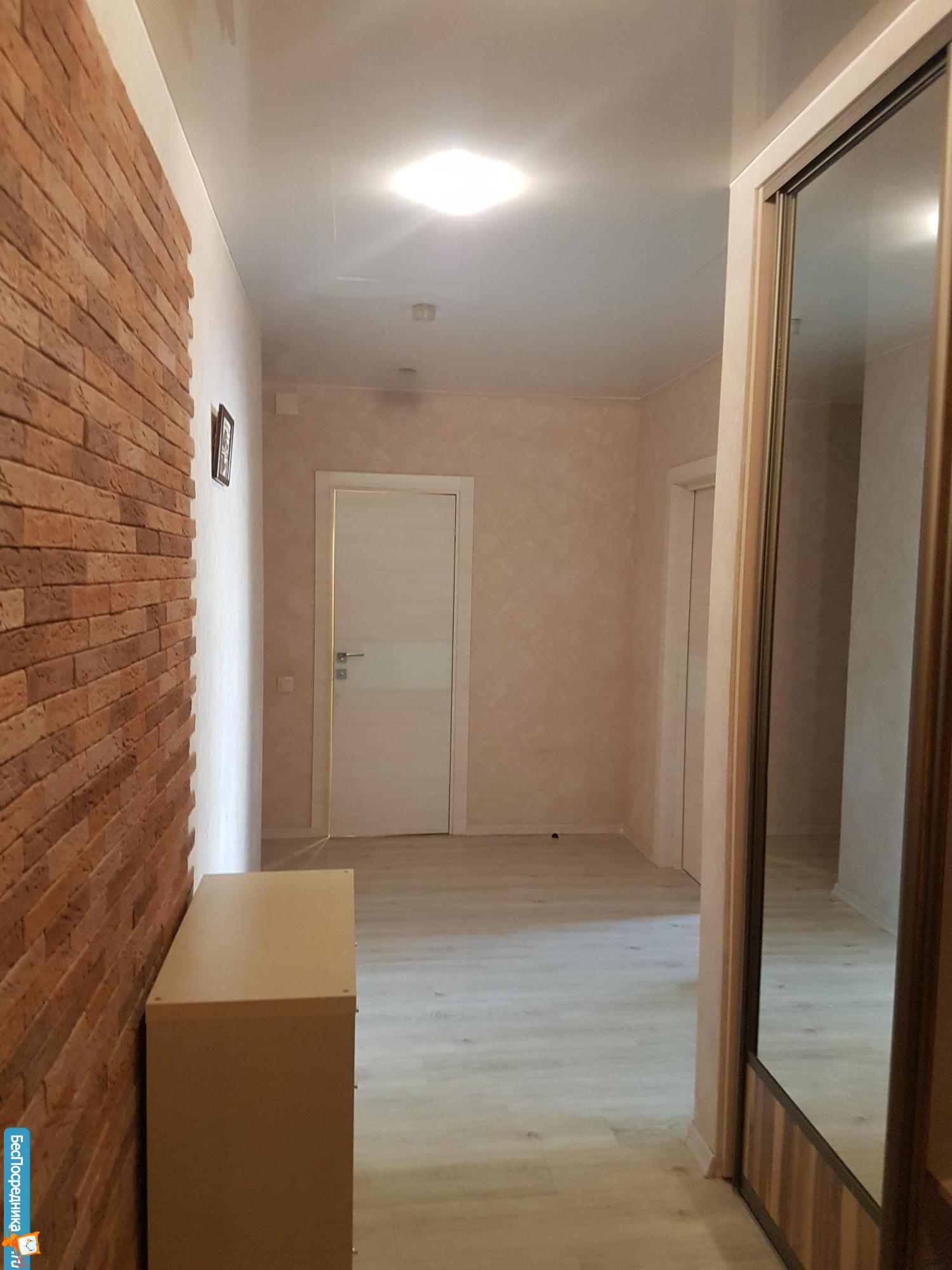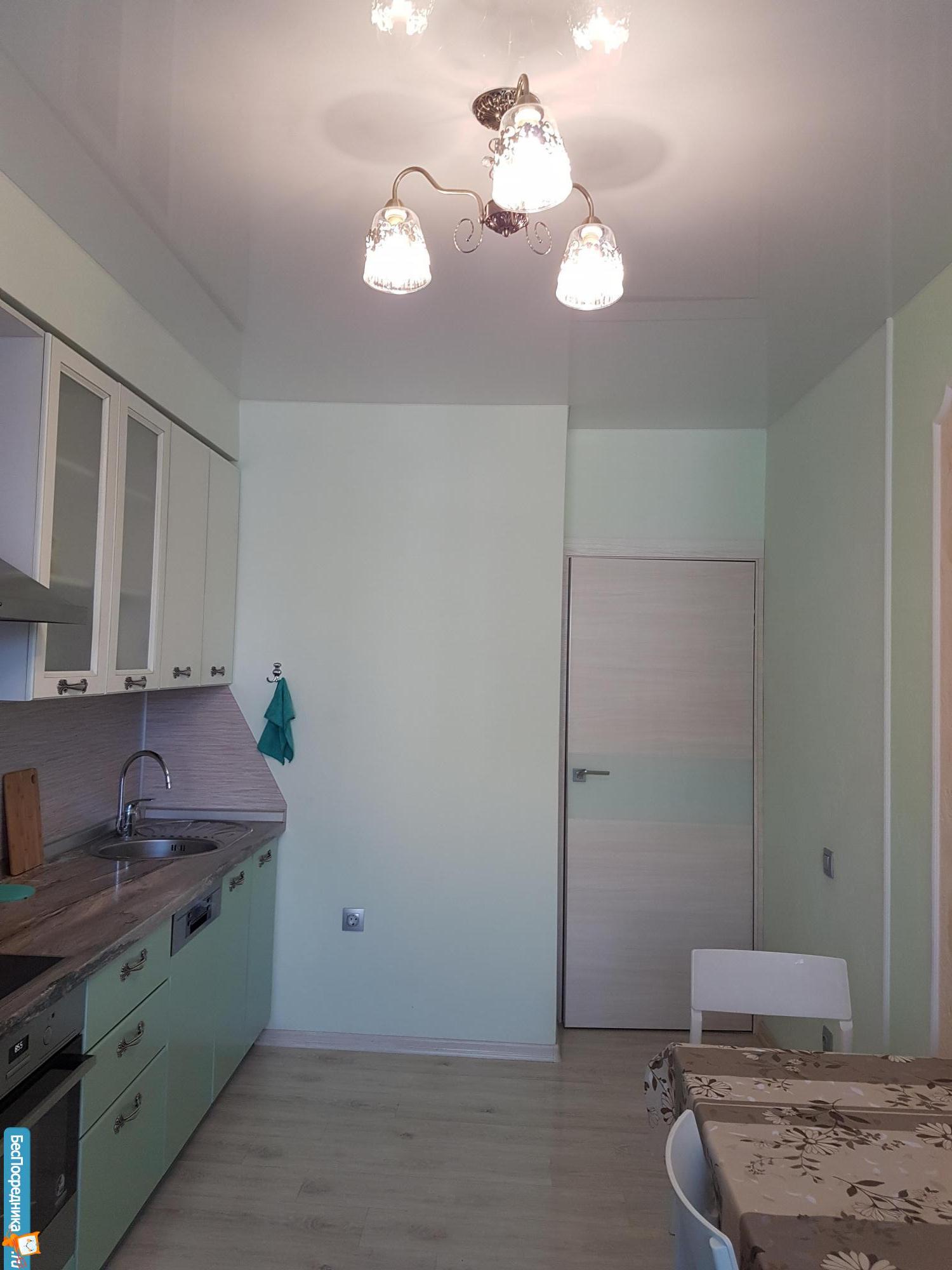 На полу в комнатах, в кухне, прихожей и на балконе ламинат. В ванной комнате и возле входной двери плитка. Натяжной потолок по всей квартире.