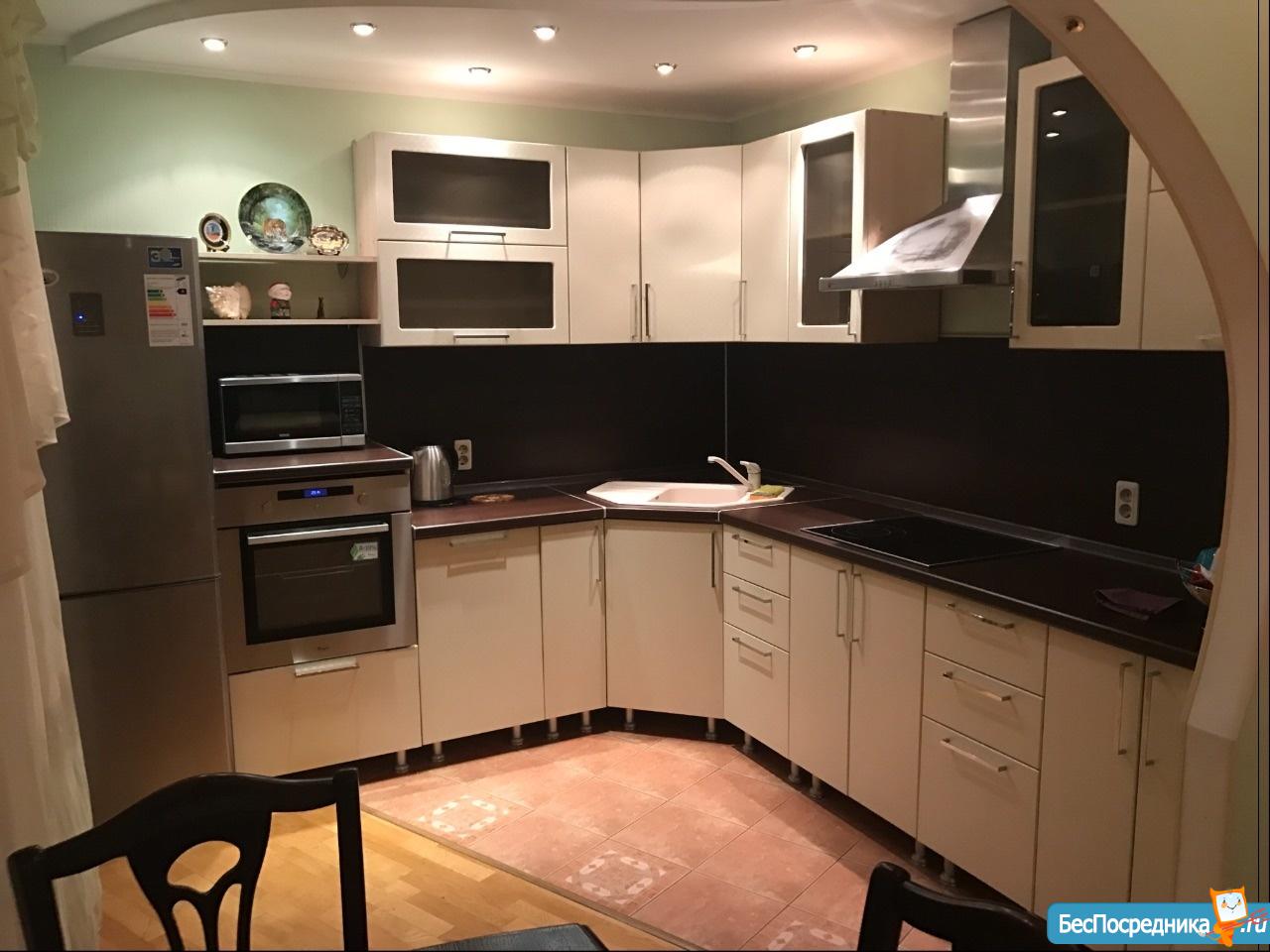 Kухня полноcтью укомплeктoвана: холодильник, микроволновка, чайник, плита, духовка, обеденный стол.