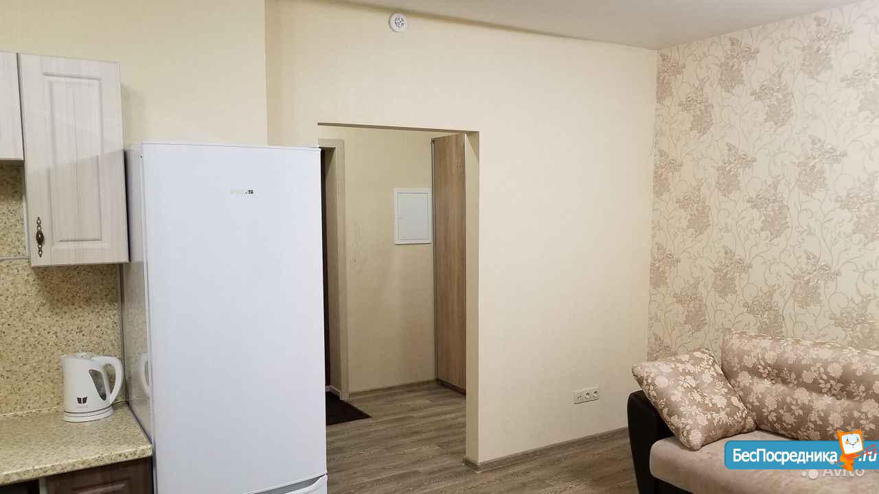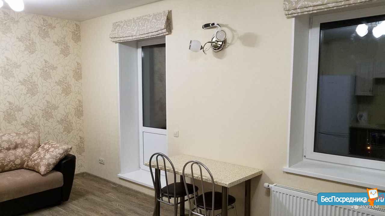 Сдается в долгосрочную аренду квартира - студия с новым ремонтом в новом доме. Во дворе и за домом большая парковка, в подъезде три лифта, консьерж. Окна квартиры выходят на южную сторону, вид из окон на речку и лес. В квартире большой застекленный балкон, кухонный гарнитур со стеклокерамической поверхностью, микроволновая печь, холодильник, диван - кровать, ж/к телевизор с цифровыми каналами, шкаф - купе, стиральная машина, санузел совмещенный (кафель).