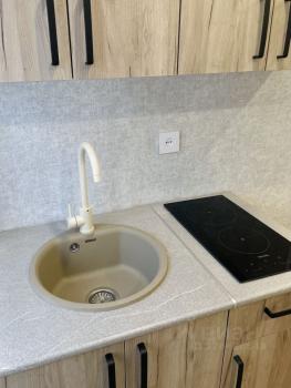 ? кухонный гарнитур со встроенной варочной поверхностью и духовым шкафом, холодильник, микроволновая печь, электрический чайник, фильтр для воды кувшин, заварник, обеденная зона на 4 персон;