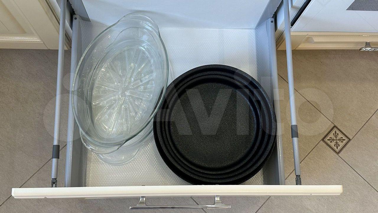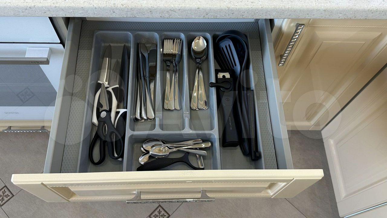 Кухонная зона: кухонный гарнитур с подсветкой, система фильтрации воды, посудомоечная машина, духовой шкаф, индукционная варочная панель, встроенная микроволновая печь, встроенный холодильник, посуда, столовые приборы.